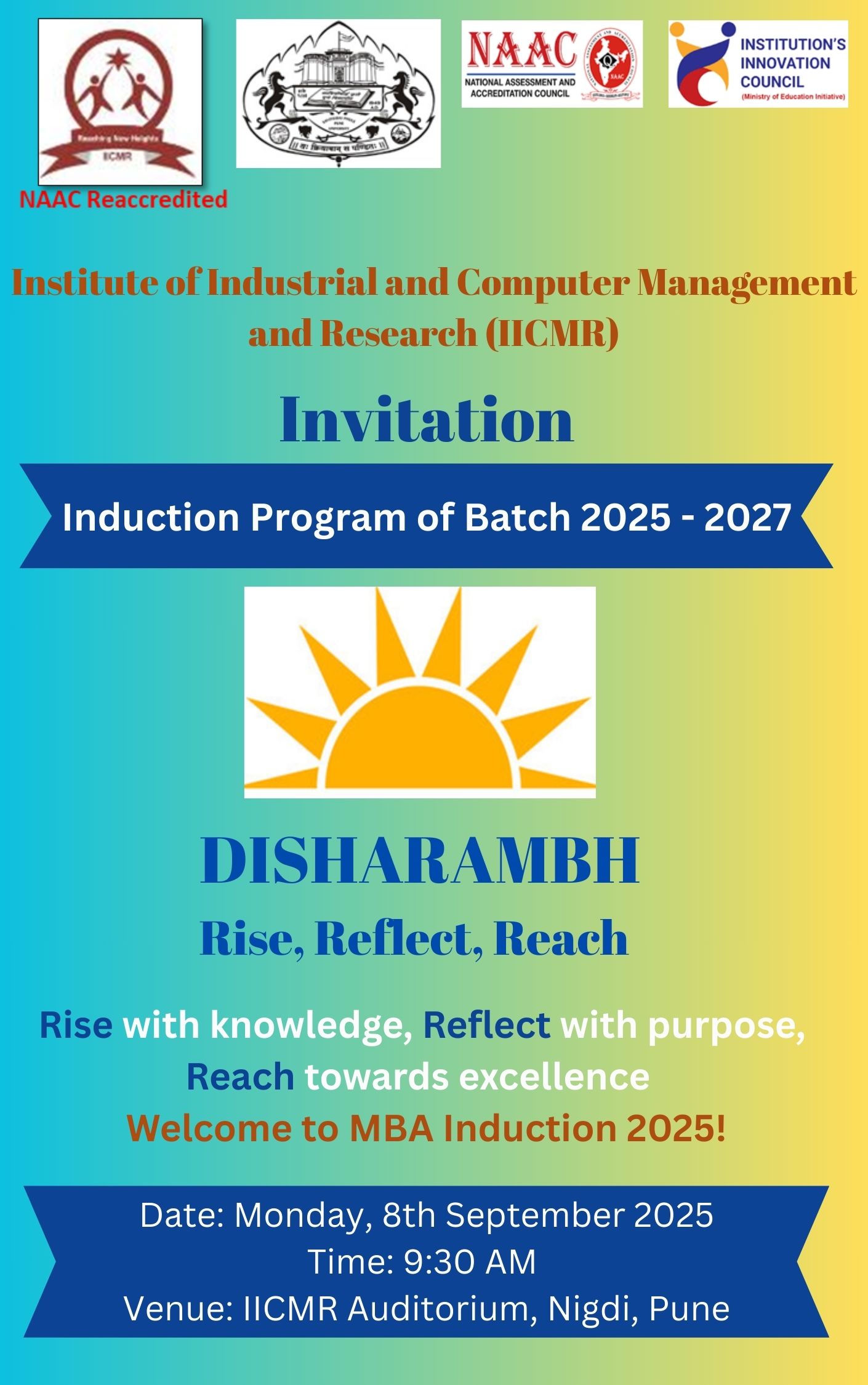 The MBA Induction Program for the 2025–2027 batch at IICMR started on 8th September 2025 with lots of energy and excitement. The day began with the National Anthem, Maharashtra Geet, and a lamp lighting ceremony to welcome the new journey.